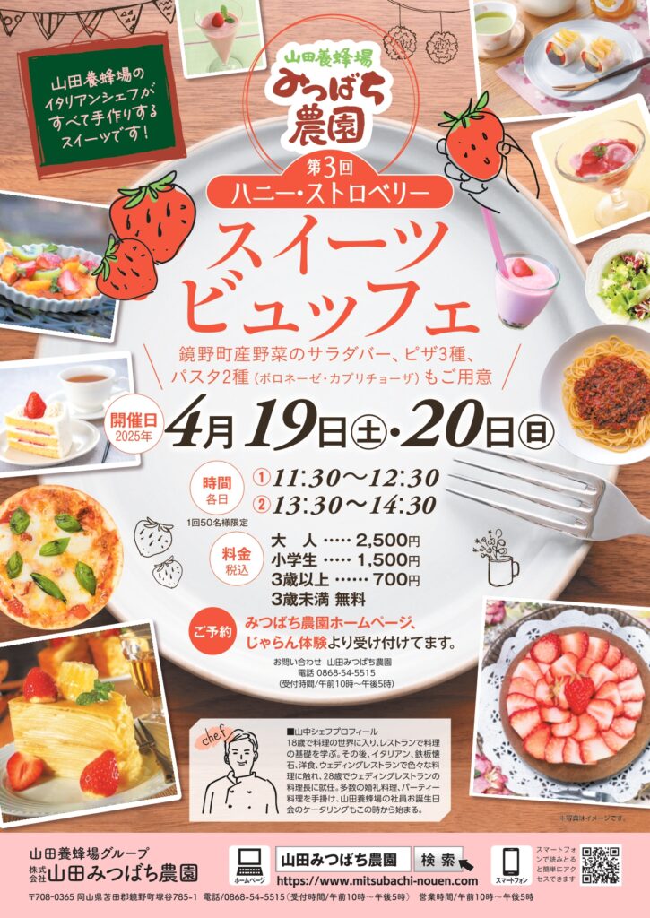 第三回ハニー・ストロベリースイーツビュッフェ開催について!山田養蜂場のはちみつ、みつばち農園のイチゴを使用したスイーツ、鏡野町産のサラダバー、パスタ2種(ボロネーゼ・カプリチョーザ)、ピザ3種(いちごデザートピザ・4種チーズ・マルゲリータ)大人気のはちみつソフトクリームが1時間お好きなだけお召し上がりいただけます。