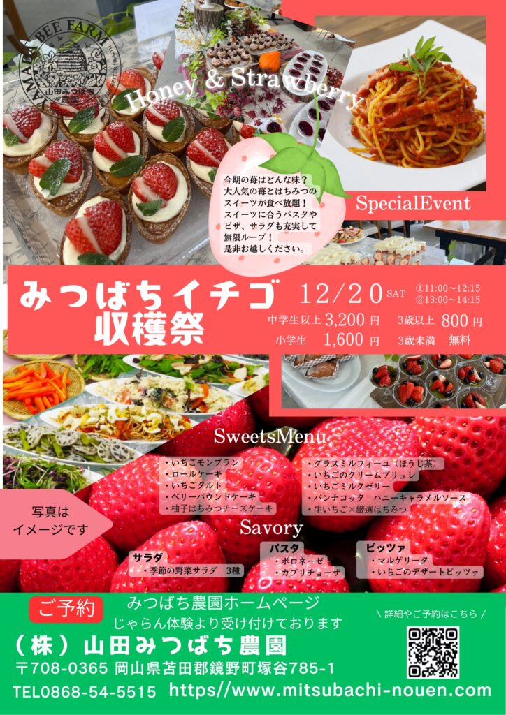 第4回ハニー・ストロベリースイーツビュッフェ(みつばちいちご収穫祭)開催について!山田養蜂場のはちみつ、みつばち農園のイチゴを使用したスイーツ、鏡野町産のサラダバー、パスタ2種(ボロネーゼ・カプリチョーザ)、ピザ2種(いちごデザートピザ・マルゲリータ)大人気のはちみつソフトクリームが1時間お好きなだけお召し上がりいただけます。
