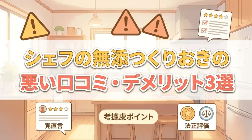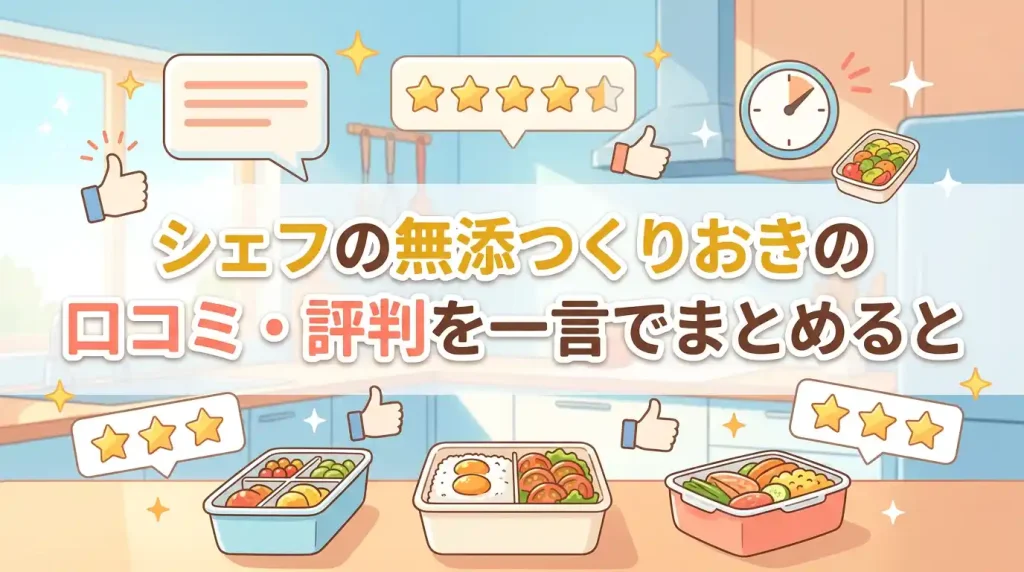 この記事では、実際に宅食サービスを複数利用してきた筆者が、シェフの無添つくりおきの口コミ・評判を分類したうえで、迷っている人が見落としがちな3つの価値まで深掘りして解説します。
