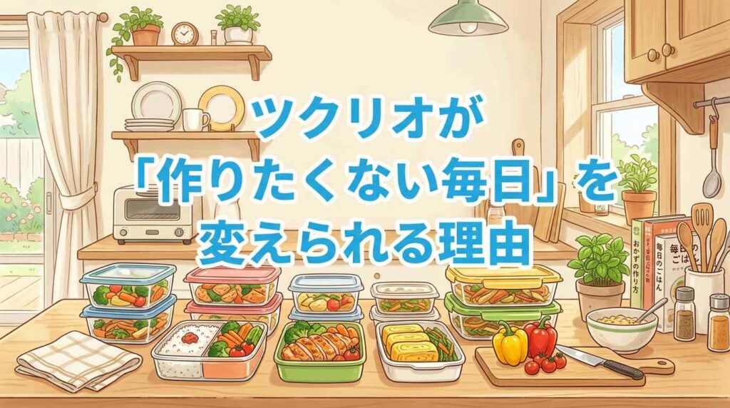 ツクリオは週替わりの固定メニュー制で、自分でメニューを選ぶことはできません。ただし「選ばなくていい」ことで献立ストレスがなくなるメリットがあります。詳しくは週替わりメニューの解説をご覧ください。