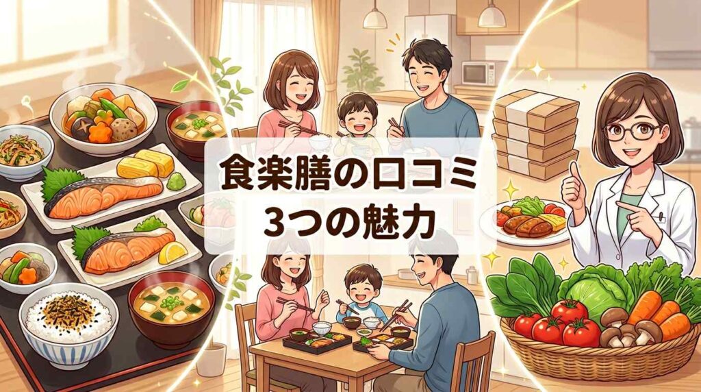 食楽膳について公開されている口コミやレビュー例を見ていくと、選びやすさ・管理栄養士監修・運営の信頼感の3点が評価されるケースが見受けられます。
