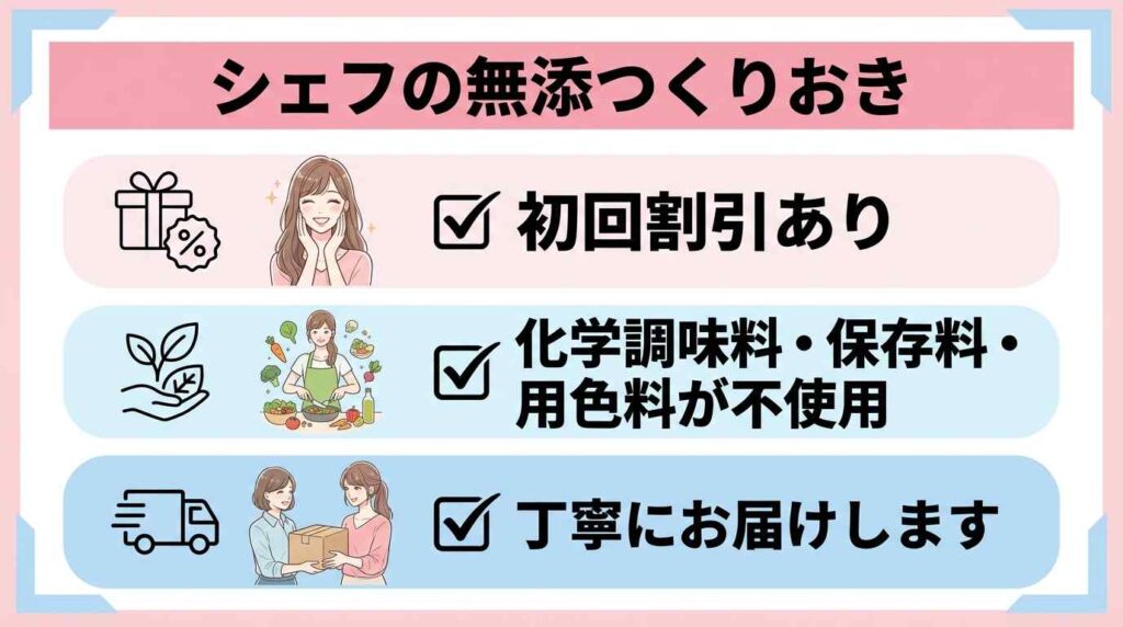 化学調味料の有無で迷う家庭は、シェフの無添つくりおきの仕組みも一度見ておくと安心して選べます。