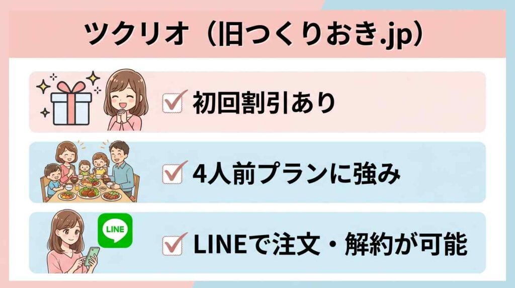 | 項目 | ツクリオ(旧つくりおき.jp) | シェフの無添つくりおき |