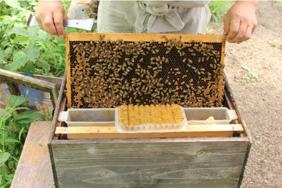 巣箱を開けてミツバチをじかに観察します。